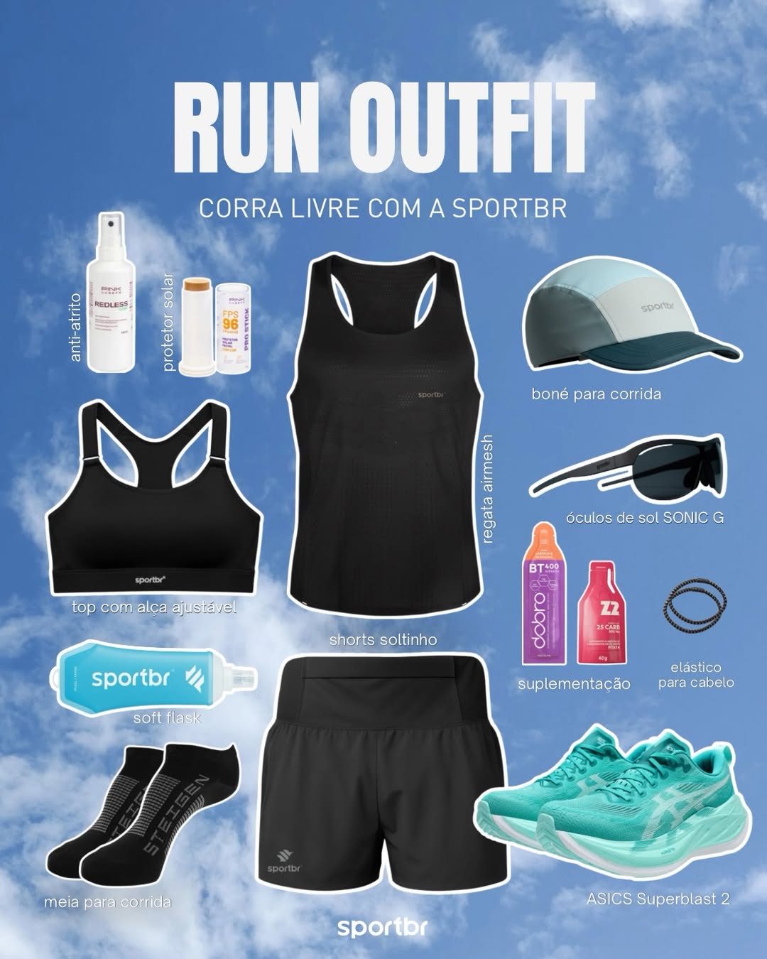 Roupas para corrida, suplementos, óculos com proteção UV400 e mais